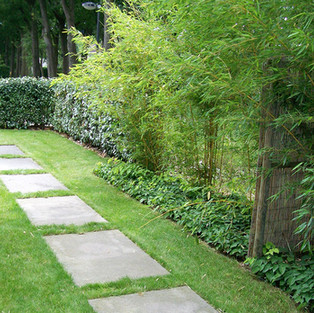 Dit huis is van een dergelijk moderne vormgeving dat je niet anders kan dan hier in meegaan in de tuin. Het huis krijgt alle aandacht ondersteund door de strakke lijnen van de tuin. De zinken gazon treden zijn maatwerk, de enorme staptegels harmoniëren met de soms bijna industriële architectuur. Mooi zoals de natuur zijn eigen stempel drukt op het beton van de staptegels. De kleuren van de materialen passen bij de grijstinten van de woning. De beplanting zorgt af en toe voor een flink kleuraccent.